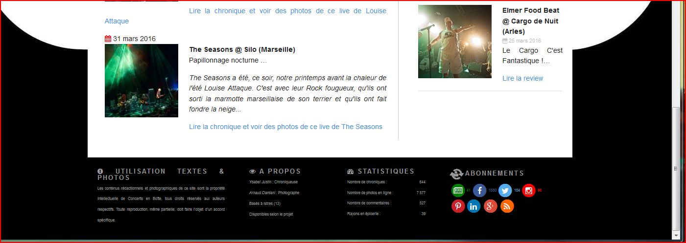 Le thème : des chroniques de concerts avec un maximum de détails et des photos. J'y suis le photographe et ma compagne la chroniqueuse.