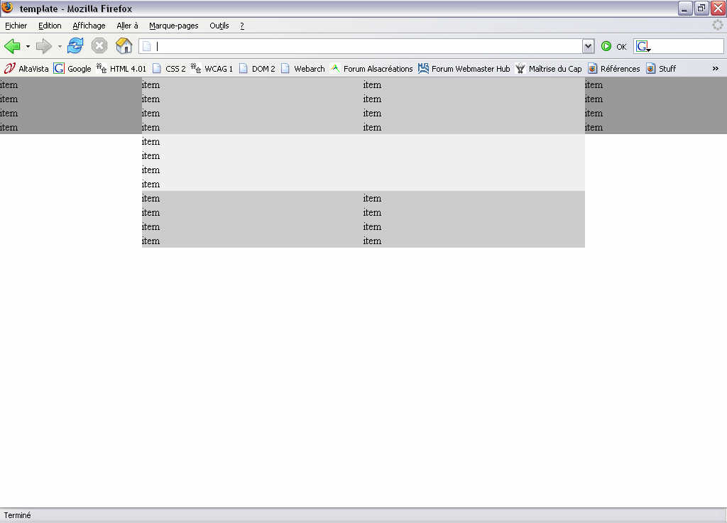 Mon but : supprimer complètement ce tableau rouge (mais en gardant l'alignement des div roses) et rendre les div bleues flottantes, de telle sorte que chacune pousse l'autre vers le bas. Ainsi je peux aisément insérer un nouveau div entre 2 bleues si besoin est, etc.