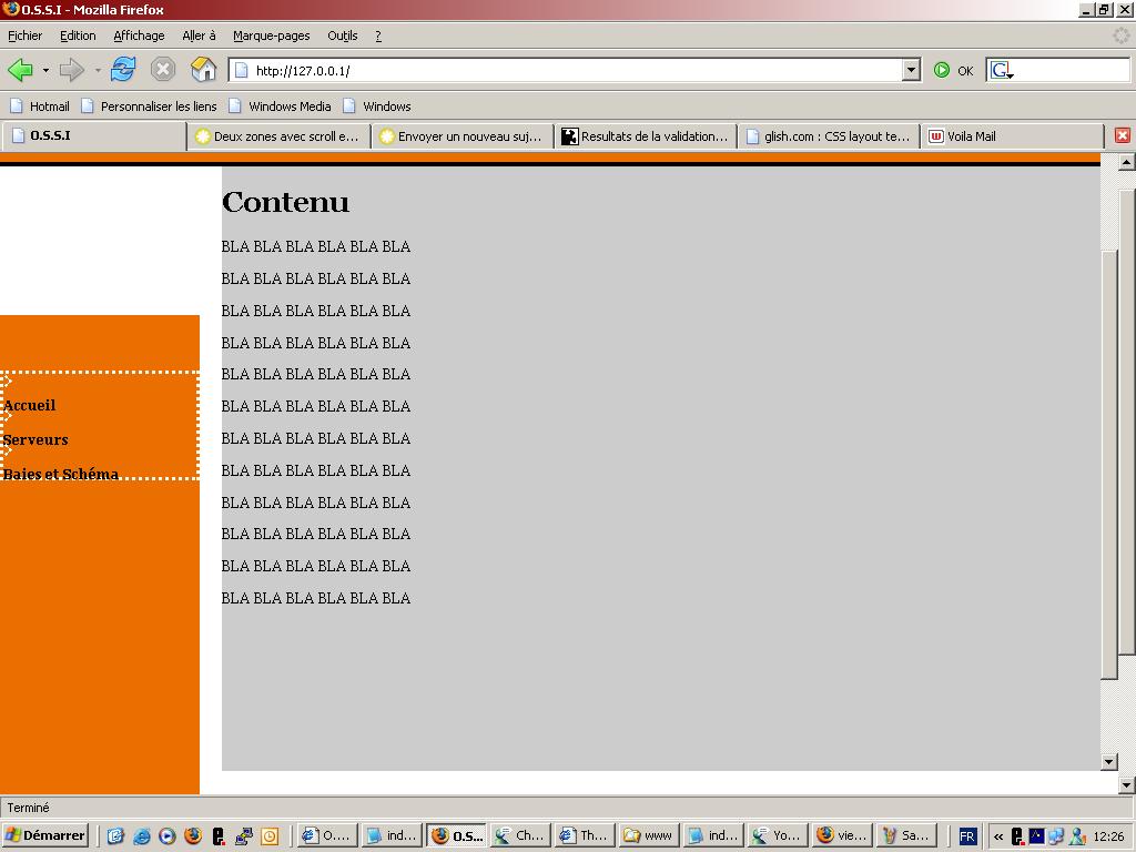 Pour cela j'ai regarder dans les modeles de créations de alsacréations, et j'ai donc utilisé le " overflow:auto" et la surprise que ce soir sur ie ou firefox, j'obtien une scroll sur le contenu et sur la page entiere, quand on descend vers le bas de la page le coté gauche descend avec son fond ( lol )