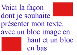 Pour l'image du haut j'ai mis un float right et elle est le texte se place bien, mais pour l'image du bas je n'y arrive pas, car mon texte est une variable, je peux donc placer le bloc au dessus ou en dessous du texte mais je n'arrive pas à ce que le texte le contourne.