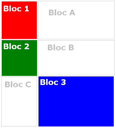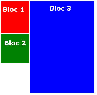 C'est-à-dire sans rajouter aucune balise à ce code, j'aurais aimé pouvoir mettre le bloc 1 et le bloc 2 l'un en dessous de l'autre, et le bloc 3 à droite, normalement...