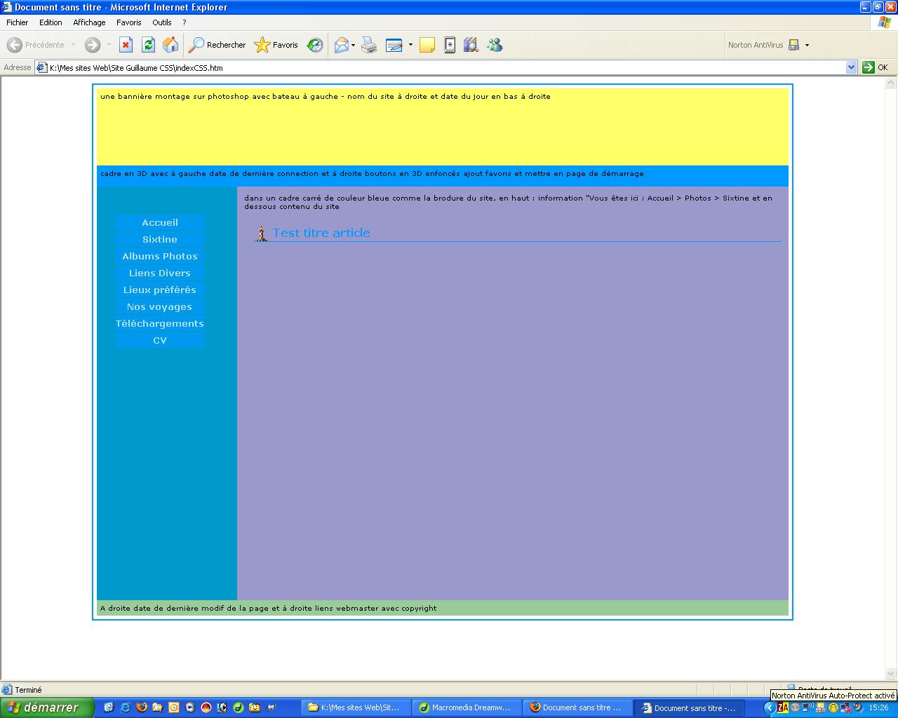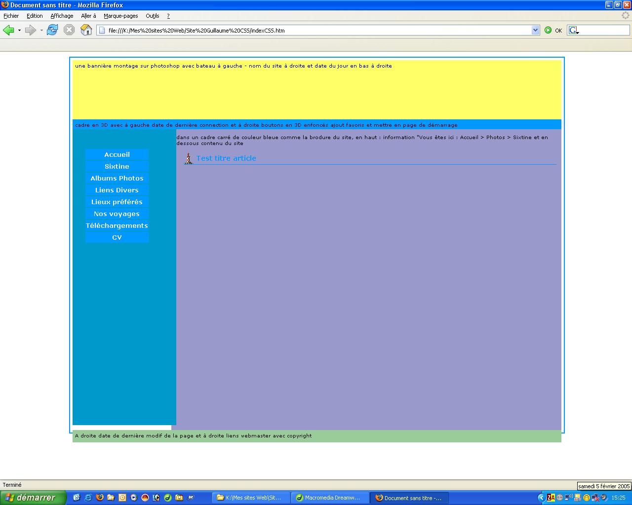<div id=centre>dans un cadre carré de couleur bleue comme la brodure du site, en haut : information "Vous êtes ici : Accueil > Photos > Sixtine et en dessous contenu du site