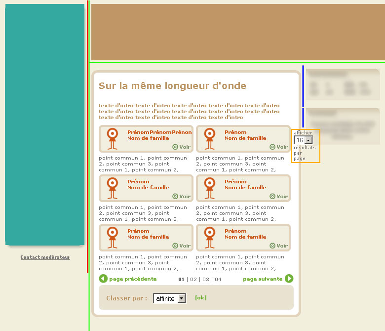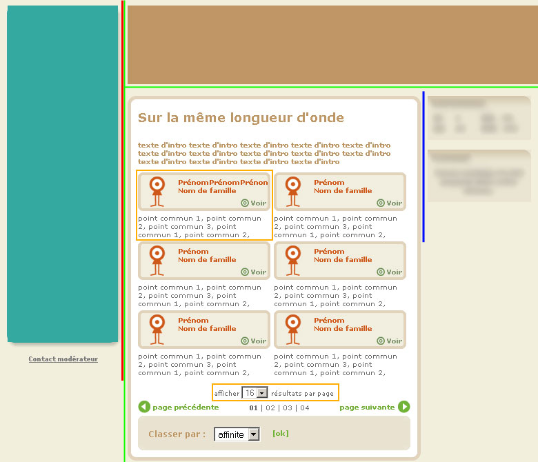 - la page est essentiellement constitué d'une série de blocs contenant un petit bloc marron et un texte. Le bloc englobant un élément marron + un paragraphe (entouré de orange pour le schéma) est en float left, et avec une largeur de 50%