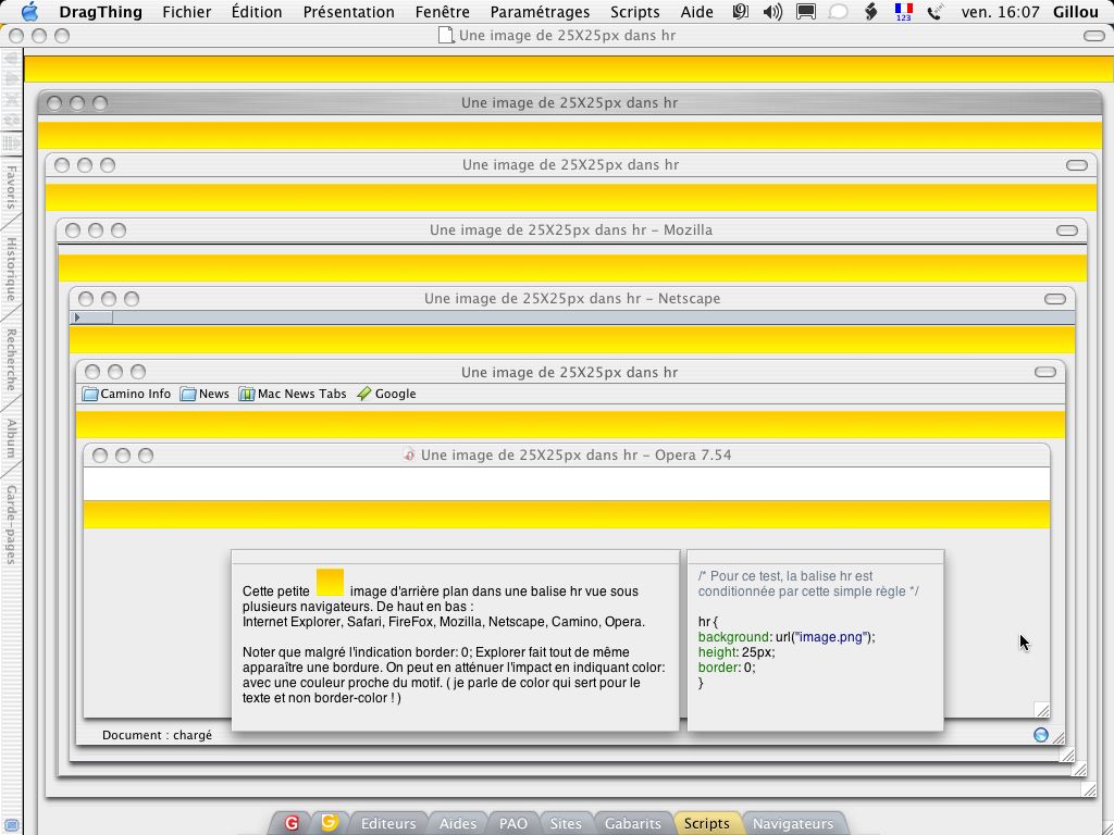 Je suis encore débutant meme si j'ai persque fini mon site en css complet. J'ai failli utiliser ce procede de hr, et finalmement, je ne l'ai pas utilisé. par contre, j'en serais venu à cette conclusion si j'avais du remplacer par une image. c'est la première procedure qui me serait venue a l'idée, merci de me confirmer maintenant que ça marche, je le saurais, si il y a une prochaine fois