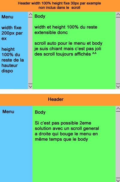 .Si vous trouvez une solution avec un scroll general qui fait bouger le menu et le body en même temps ça sera déjà pas mal, mais y faut pas que le head soit inclus dans le scroll.
