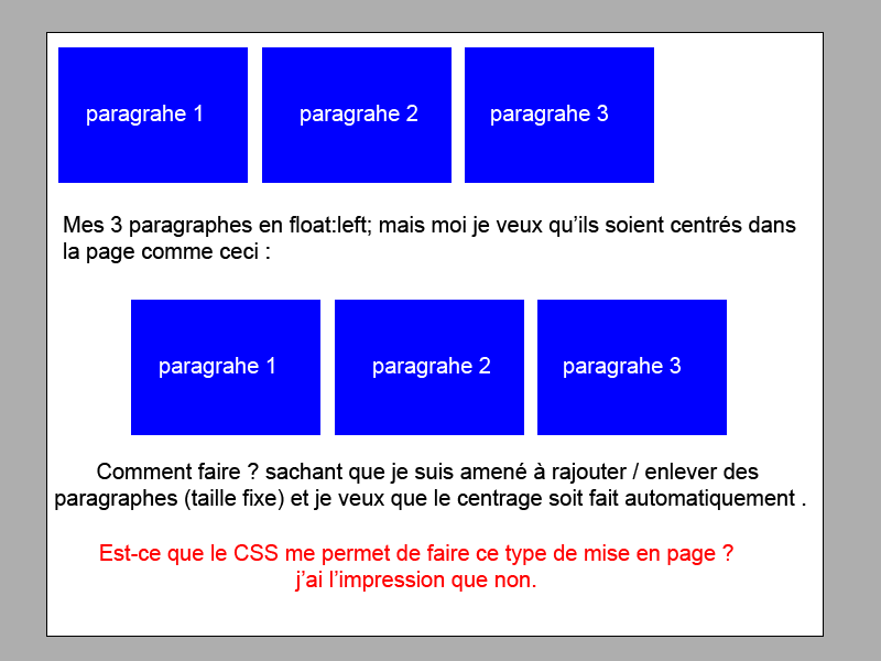le problème c'est que j'aimerais que tout ces paragraphes soient centrés horizontalement par rapport à ma page. Et avec le float ça ne marche pas car il vont tous aligné sur la gauche.
