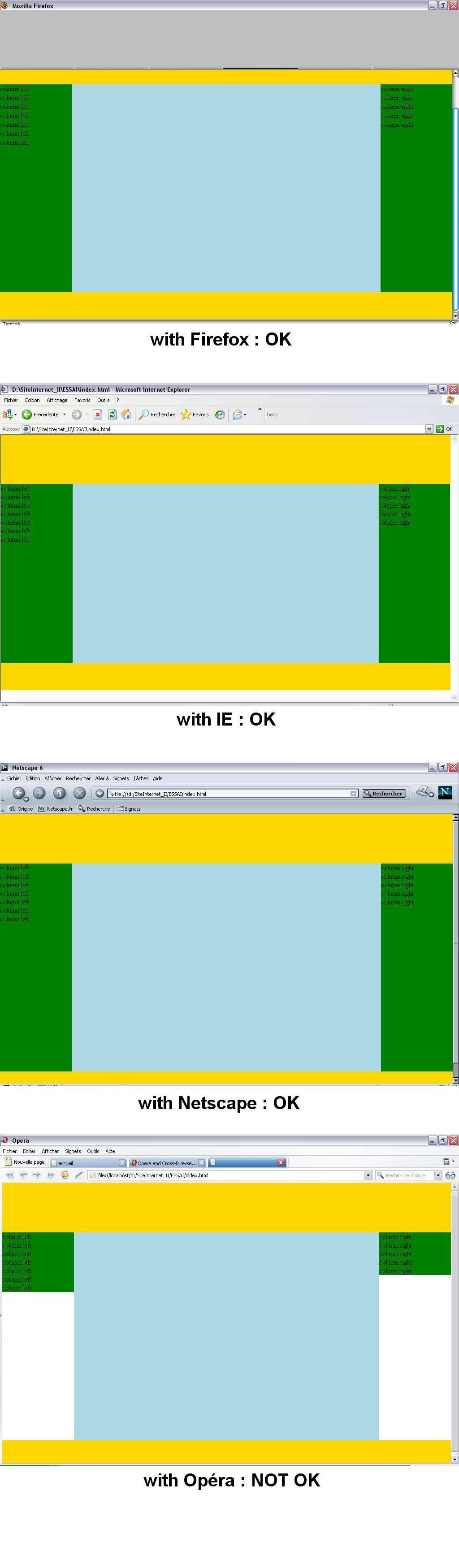Le tout fonctionne parfaitement avec FF, IE, Netscape, mais opéra refuse de m'étirer mes blocs latéraux en fonction de la hauteur de son conteneur qui est le corps.