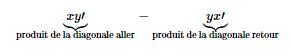 <p><span class="terme">xy'</span><span class="explication">produit de la diagonale "aller"</span> - <span class="terme">yx'</span><span class="explication">produit de la diagonale "retour"</span></p>